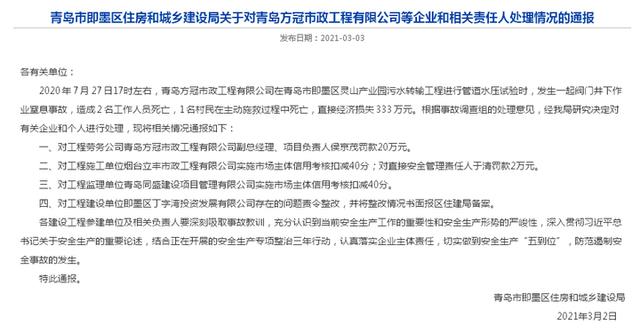 3月3日,青島市即墨區(qū)住房和城鄉(xiāng)建設(shè)局發(fā)布于對青島方冠市政工程有限公司等企業(yè)和相關(guān)責(zé)任人處理情況的通報。通報稱,2020 年 7 月 27 日17時左右,青島方冠市政工程有限公司在青島市即墨區(qū)靈山產(chǎn)業(yè)園污水轉(zhuǎn)輸工程進(jìn)行管道水壓試驗時,發(fā)生一起閥門井下作業(yè)窒息事故,造成 2 名工作人員死亡,1 名村民在主動施救過程中死亡,直接經(jīng)濟(jì)損失 333 萬元。根據(jù)事故調(diào)查組的處理意見,經(jīng)我局研究決定對有關(guān)企業(yè)和個人進(jìn)行處理,現(xiàn)將相關(guān)情況通報如下: