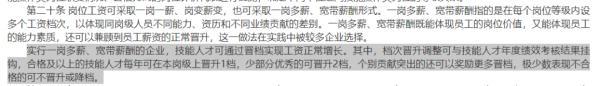 根據(jù)指引中的具體規(guī)定,崗位工資可采取一崗一薪、崗變薪變,也可采取一崗多薪、寬帶薪酬形式。其中實(shí)行一崗多薪、寬帶薪酬的企業(yè),技能人才可通過晉檔實(shí)現(xiàn)工資正常增長。