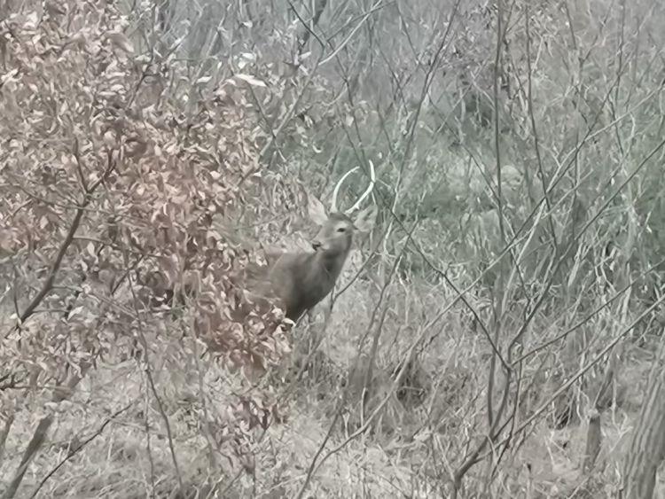 “當(dāng)時我正開著車在山上四處轉(zhuǎn),突然看見側(cè)前方不到10米的距離內(nèi),驚現(xiàn)一頭鹿正在小樹林里不慌不忙地吃草,我當(dāng)時非常吃驚,就趕緊拿起手機(jī)拍了下來,我看它頭上有角,肯定是一頭公鹿,目測得有200多斤重!眳秋@竹說,“我當(dāng)時是在車上拍的視頻,這頭鹿大概在我視線里持續(xù)了十多分鐘,你不動它就不走,后來我下車了,它也沒走,我上前走了幾步后,它就跑了,還是怕人的,它跑的時候又同時出現(xiàn)了6頭,跟著那一頭一塊跑了!