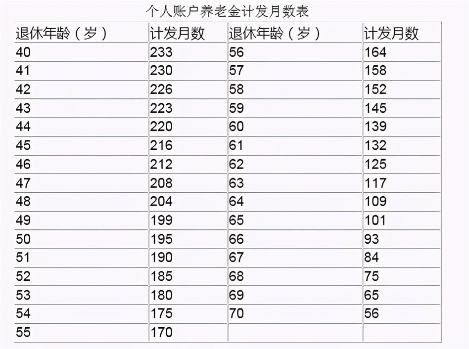目前的個人賬戶計發(fā)月數(shù)表規(guī)定是,60歲退休對應(yīng)的計發(fā)月數(shù)是139個月,55歲退休對應(yīng)的是170個月,50歲退休對應(yīng)的是195個月。