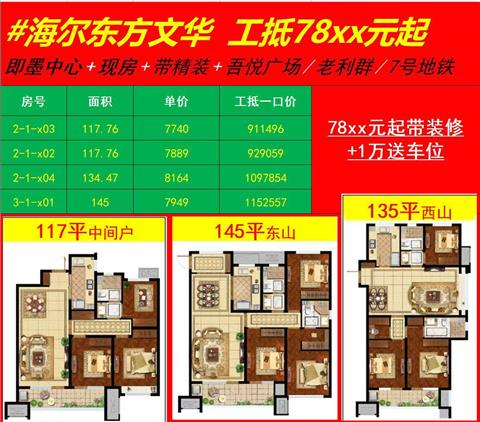 3室/92萬(wàn)/117平米/海爾東方文華新房工抵套三雙衛(wèi)多套房子可選