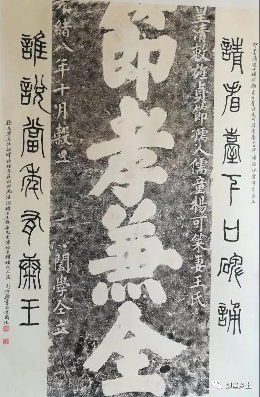 碑面正中鐫刻題詞“節(jié)孝兼全”, 四個楷書大字書刻俱佳,飛白與牽絲映帶鐫刻清晰,字勢飛動,堅勁飽滿,莊嚴肅穆,有凜然不可侵犯之感。右款為“皇清敕旌貞節(jié)孺人儒童楊可箂妻王氏”。左款為“光緒八年十月榖旦 闔學仝立”。