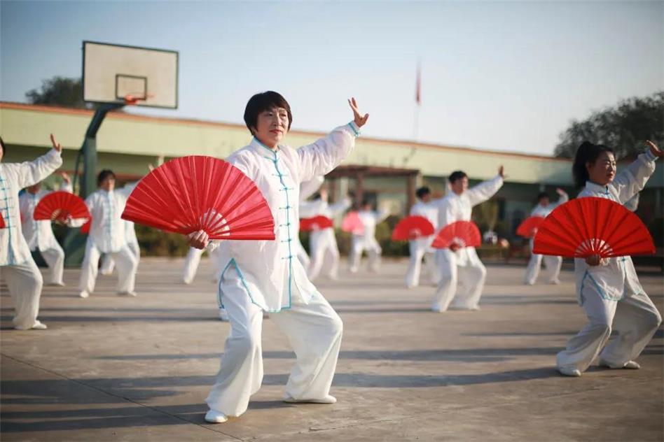 即墨區(qū)龍山街道西程哥莊村村民在練習(xí)太極扇