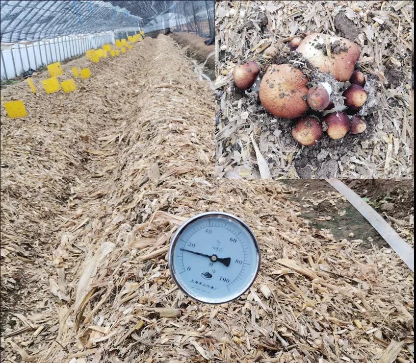 秸稈生物熱氣肥是對傳統(tǒng)秸稈生物反應(yīng)堆的升級改造,用全生物降解地膜包裹的方式在秋季定植時施用熱氣肥,冬季根據(jù)需要隨時用工具打孔,扎破降解地膜,水分滲入就可以啟動原料發(fā)酵,達(dá)到秸稈生物熱氣肥的緩釋效果。它能有效提高地溫,補(bǔ)充棚內(nèi)二氧化碳濃度,使冬季設(shè)施種植作物提前上市,延長生育期,進(jìn)而達(dá)到增產(chǎn)增收效果。