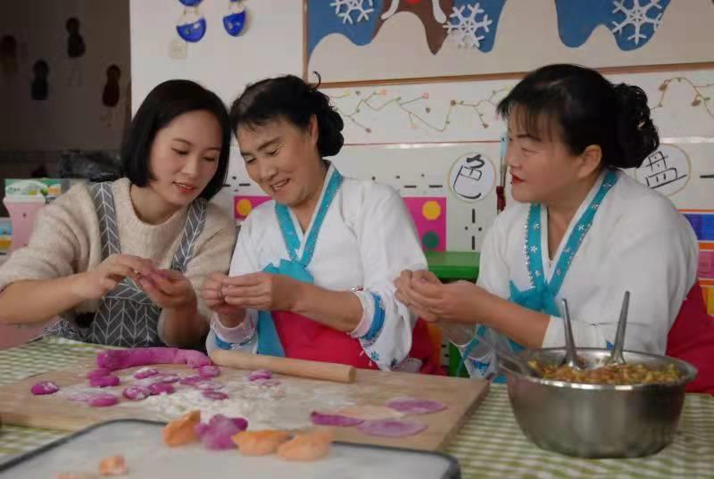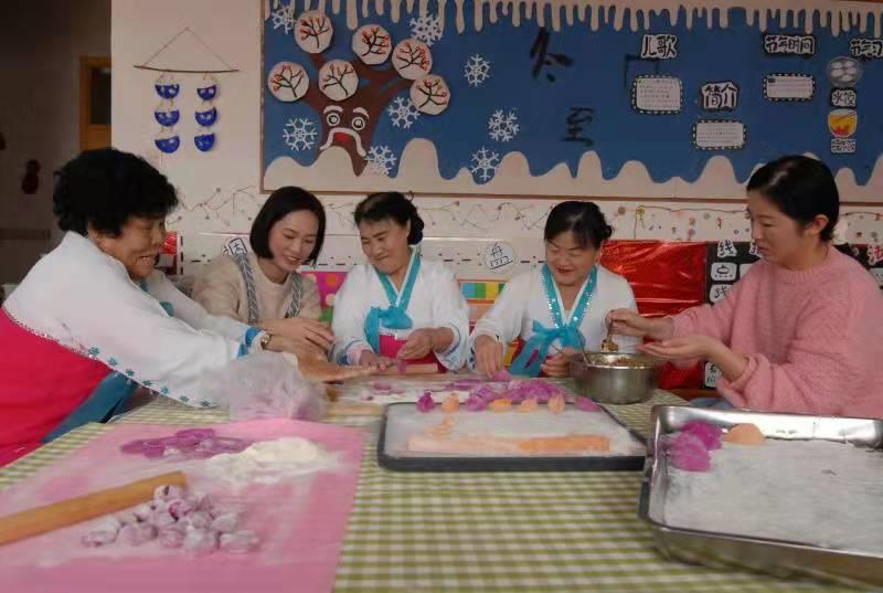 居民們分工協(xié)作,包餡、擺盤,忙得不亦樂乎,用自己拿手的方式包著各式各樣的餃子。居民和居住在本社區(qū)的朝鮮族居民們洗菜、和面、搟皮……活動現(xiàn)場儼然成了“歡樂大廚房”,大家分工協(xié)作,配合默契,個個動作嫻熟,一雙雙靈巧的手把濃濃的冬至情包進圓鼓鼓的餃子里。大家有說有笑,現(xiàn)場氣氛溫情融洽、笑語不斷,居委會里洋溢著“家”的溫馨、“家”的味道,密切了鄰里關(guān)系。你拌餡,我搟皮,一邊忙著包餃子,一邊開心拉家常,其樂融融……