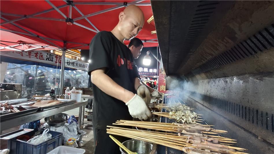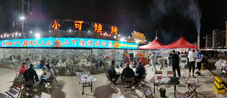 千米長(zhǎng)的燒烤街,家家座無(wú)虛席,門前還有不少顧客正排隊(duì)等座!昂芟矚g來(lái)這里,坐著馬扎,吃著烤肉非常接地氣!币晃活櫩驼f(shuō),氤氳的煙火氣讓他在大快朵頤同時(shí),感受到濃濃的氛圍感。