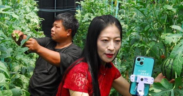 網(wǎng)絡(luò)主播走進(jìn)大棚,向觀眾介紹迷你西瓜。