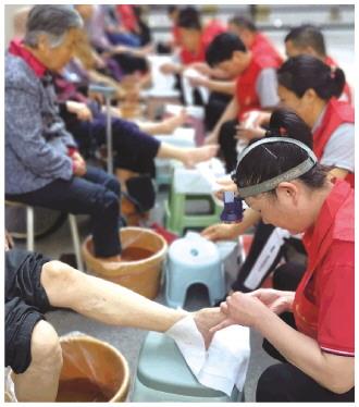 圖為景岱社區(qū)聯(lián)合愛(ài)心商戶(hù)為社區(qū)老人按摩、修腳。
