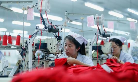 10月7日,山東省青島市即墨區(qū)龍山街道一家服裝企業(yè)的工人在生產(chǎn)出口到海外市場的成衣產(chǎn)品。