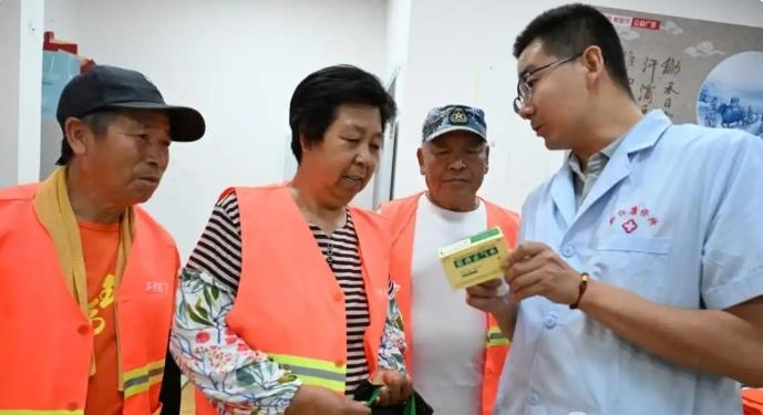志愿者為環(huán)衛(wèi)工人送上藿香正氣水、風(fēng)油精、毛巾等防暑物品。(來源:即墨區(qū)委宣傳部)