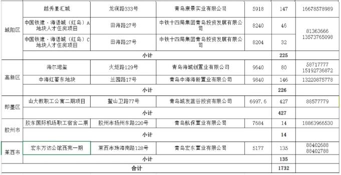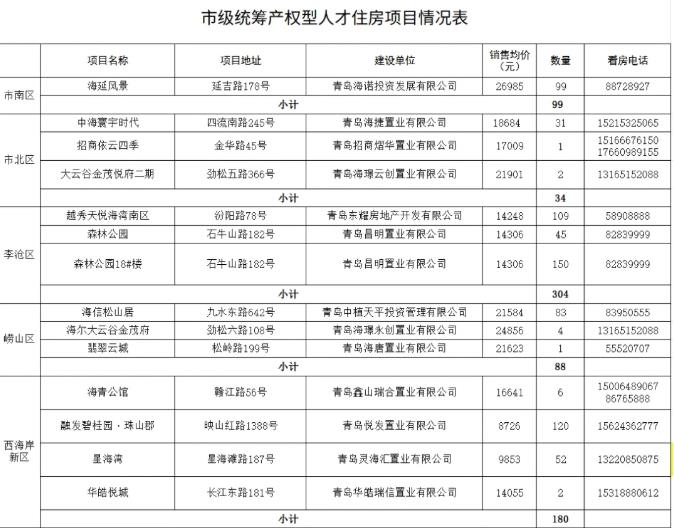 小編注意到,情況表中包括市南區(qū)1個(gè)項(xiàng)目、市北區(qū)3個(gè)項(xiàng)目、李滄區(qū)3個(gè)項(xiàng)目、嶗山區(qū)3個(gè)項(xiàng)目、西海岸新區(qū)4個(gè)項(xiàng)目、城陽(yáng)區(qū)3個(gè)項(xiàng)目、高新區(qū)2個(gè)項(xiàng)目、即墨區(qū)1個(gè)項(xiàng)目、膠州市1個(gè)項(xiàng)目、萊西市1個(gè)項(xiàng)目。名單中既有這些在售產(chǎn)權(quán)型人才住房項(xiàng)目的名稱、具體地址,還包含建設(shè)單位、銷售均價(jià)、數(shù)量以及看房電話。