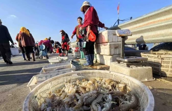 “快來(lái)看看!剛上岸的梭子蟹,35元一斤,保準(zhǔn)新鮮!睗O家大嫂王秀麗從船上接過(guò)一筐梭子蟹,麻利地放在攤位上,大聲吆喝起來(lái)。她的攤位前很快圍滿了人,有的市民已經(jīng)迫不及待地蹲下身,用手輕輕捏著蟹子的腹部,挑選著肥美的梭子蟹。