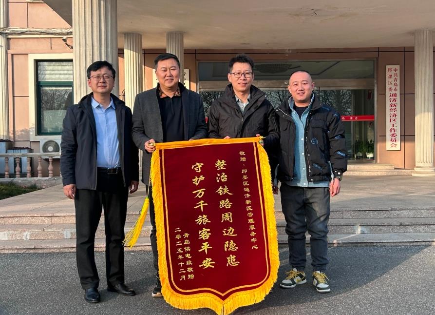 2025年以來,即墨區(qū)通濟新區(qū)與中國鐵路濟南局集團有限公司青島供電段不斷加強溝通,在青榮城際鐵路沿線整治工作中密切協(xié)作,改善了鐵路沿線周邊環(huán)境。近日,中國鐵路濟南局集團有限公司青島供電段將一面“整治鐵路周邊隱患 守護萬千旅客平安”的錦旗送給通濟新區(qū),對過去一年來新區(qū)在青榮城際鐵路沿線環(huán)境治理中的積極貢獻表示感謝,通濟新區(qū)也向鐵路方對新區(qū)工作的配合與支持表示感謝。